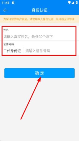 4、在身份认证页面输入真实姓名和二代身份证证件号码,点击确定即可完成身份认证。