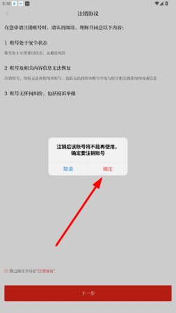 4、在注销协议页面,仔细阅读相关内容后,点击弹出窗口中的确定按钮,完成账号注销操作。