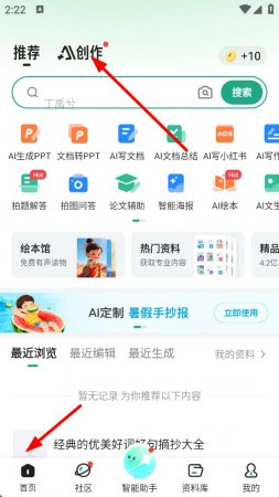 1、打开百度文库APP,进入首页界面,点击上方的AI创作。
