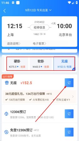 4、在车次详情页面,选择想要购买的座位类型,点击右侧的订按钮,完成支付即可购买车票。