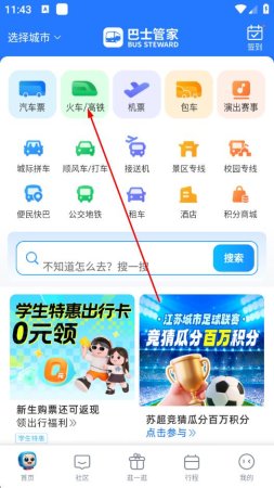 1、打开巴士管家App,在首页点击火车/高铁选项。