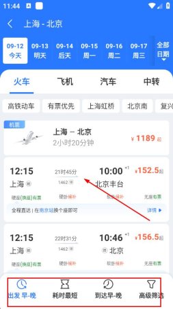 3、在查询结果页面,通过出发早-晚、耗时最短、到达早-晚、高级筛选等条件筛选车次,点击进入详情页面。