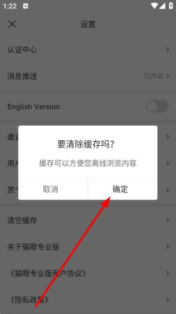 3、在设置的界面,点击清空缓存按钮,弹出清除缓存的确认框。