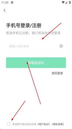 2、进入手机号登录/注册页面,输入手机号码,勾选登录即代表阅读并同意用户协议隐私条款,点击获取验证码。
