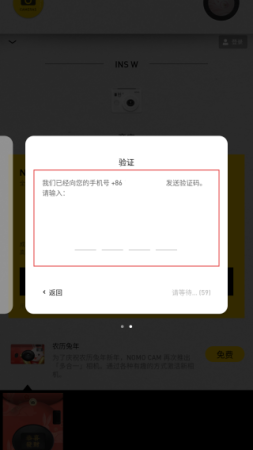 4、在验证界面,输入手机收到的验证码,完成NOMO相机账号登录。