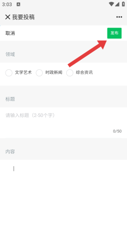 4、在我要投稿界面,选择领域等内容后,点击发布按钮,完成投稿操作。