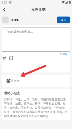 3、在发布此刻的界面,需要点击写文章的选项,进入投稿的界面。