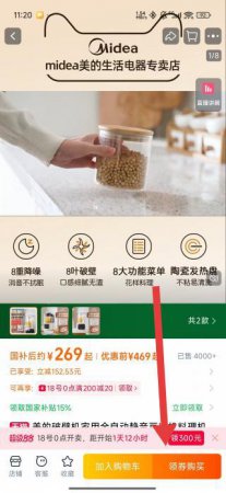 3、进入美的生活电器专卖店的商品页,了解8重降噪等产品功能,关注国补优惠及超级88活动开售时间。