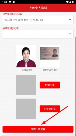 4、填写好信息后,点击拍摄头像和拍摄身份证按钮,分别拍摄并上传头像和身份证照片,最后点击立即上传资料完成个人信息填写与提交。
