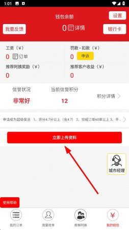 2、在我的钱包页面,点击立即上传资料按钮,进入上传个人资料界面。
