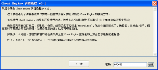 这个教程是为了讲解游戏中作弊的一些基本步骤,并让你熟悉 Cheat Engine 的使用方法。首先运行 Cheat Engine ,如果你还没运行的话。然后点击 "选择进程" 图标按钮 (左上角有电脑的那个图标),当进程列表窗口打开后,找到这个教程,进程的名字应该是 "tutorial.exe" ,除非你把它改名了,选择它,并点击 打开 。现在暂时不要理会其它的按钮,如果你愿意的话,以后再研究它们。如果没什么问题,进程列表窗口将会消失并且在 Cheat Engine 主界面的上方会显示选择的进程名。好了,点击 "下一步" 按钮进入下一个步骤 (或输入密码进入你想练习的步骤)。
