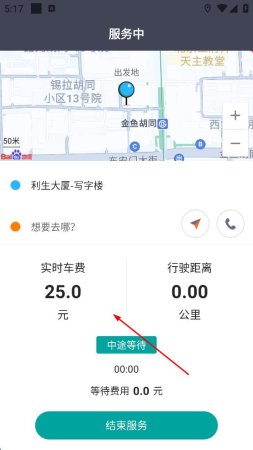 3、完成相关信息填写后,点击“确认创单”按钮,进入服务中页面,此时可查看实时车费、行驶距离等信息,服务结束后点击“结束服务”即可。
