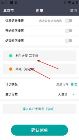 2、在创单页面,可根据需求设置订单语音播报、短信提醒等功能,然后填写出发地,若有需要也可填写终点,接着确认计价模板等信息。