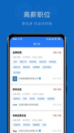 头职是云南本地的专业求职招聘找工作平台,业务覆盖云南全省,包括昆明、曲靖、大理、玉溪、红河、楚雄、文山、普洱、保山、西双版纳、昭通、德宏、临沧、丽江、迪庆等,覆盖行业:互联网、金融、汽车、房产、快消、制造、人工智能、广告传媒等各行各业,现已成为销售、财务、技术、IT、产品、人资、管理……广大求职者选择的应用APP。平台作为企业和求职者沟通的桥梁,让人才和机会更准确高效地建立连接。通过头职提供的服务,可以让企业高效便捷地获取到更新的人才资讯,使企业HR在抢才的过程快人一步,用更短的时间、更低的成本、更准确的方式锁定合适的人才。通过为求职者提供丰富的职位信息,打造匹配的职位搜索引擎,创造流畅的信息交流渠道,头职力求为更多的求职者提供合适的工作岗位和普遍的职业晋升机会,帮助职场人更成功。