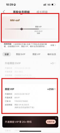 4、在会员详情页面,就能看到黑胶VIP等会员类型的到期时间,以及开通时间、开通来源等详细信息。