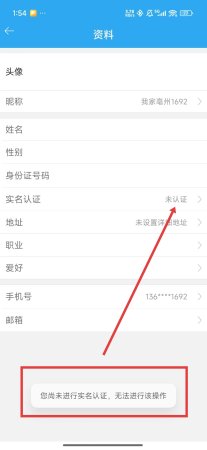 2、在跳转到资料页面中,显示还未实名认证无法操作,点击实名认证选项进入实名认证。