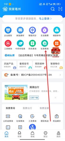 1、在进入到我家亳州首页中,点击首页中的社保查询选项,进入查询社保。
