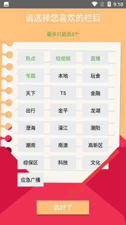 1、进入栏目选择界面,挑选至多5个喜爱的栏目如热点、短视频等,选完点击底部选好了按钮,完成个性化栏目定制流程。