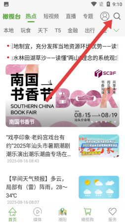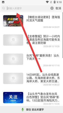 3、在搜索页面顶部的请输入关键字输入框中,录入想查找的资讯关键词如台风预警、南国书香节,快速检索对应内容。