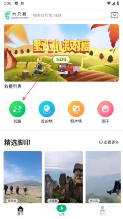 1、打开六只脚APP,点击首页的线路图标,进入线路游记页面。