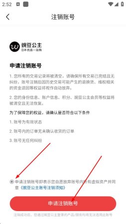 5、勾选申请注销账号即表示您自愿放弃账号内所有虚拟资产并同意《豌豆公主账号注销须知》,点击申请注销账号按钮。