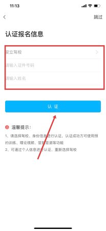 4、在认证报名信息页面,输入自己的证件号码和姓名,点击认证按钮,完成驾校绑定。