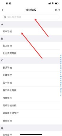 3、进入选择驾校页面,可在搜索栏输入驾校名称快速查找,也可以直接在列表中找到自己报名的驾校并点击选择。