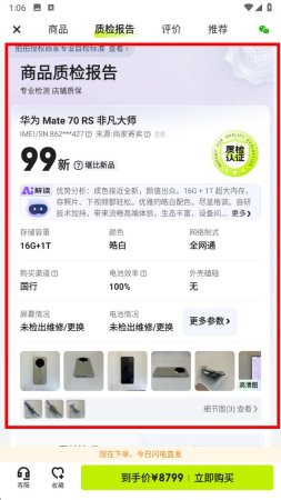 3、进入后下滑即可查看该商品详细的质检信息,包括成色、存储容量、网络制式等参数-还能查看商品的细节高清图片。