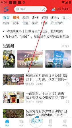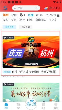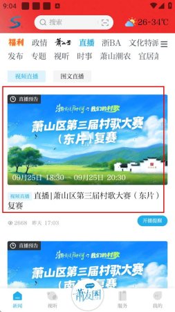 1、打开萧山发布App,点击顶部导航栏直播选项。