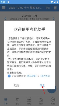 1、打开考勤助手应用,在欢迎使用弹窗中,点击同意按钮,进入打卡界面。