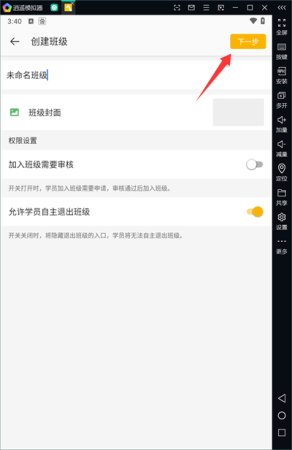 3、之后进入创建班级界面,在这里输入班级名称以及封面等信息,之后点击下一步;