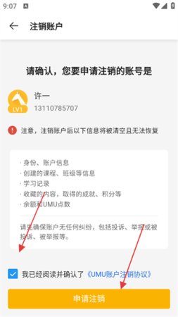 4、勾选我已经阅读并确认了UMU账户注销协议,点击申请注销即可。