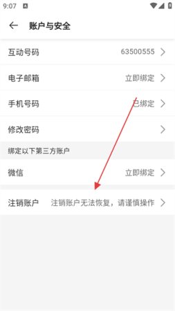 3、进入账户与安全页面后,点击注销账户选项,注意注销账户无法恢复,需谨慎操作。