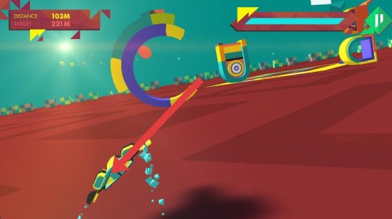 3、通过操作屏幕来控制几何物体的飞行方向,躲避赛道上各种形状的障碍物。