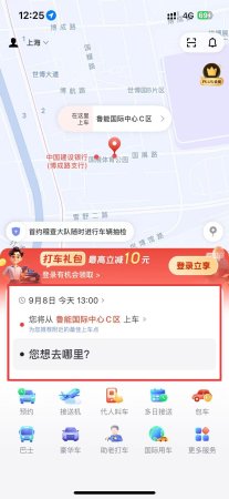 3、确定用车时间后,在输入框中填写上车点和要前往的目的地,完成上下车地点的设置。