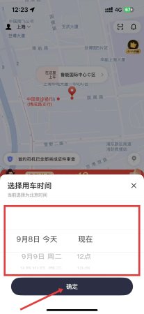 2、在弹出的选择用车时间界面中,选择你需要用车的日期和具体时间,然后点击确定按钮。