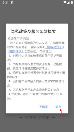 1、打开建标库app,在弹出的隐私政策及服务条款概要界面,找到“同意”按钮,点击该按钮。