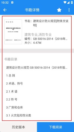 4、在书籍详情页面中,就可以查看到建筑设计防火规范的书名、专业分类、编号、大小以及书籍目录等详细信息。