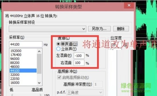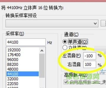 3.之后在弹出的窗口中将“通道”设置为单声道,并且将左混音改为“-100”右混音改为“100”;