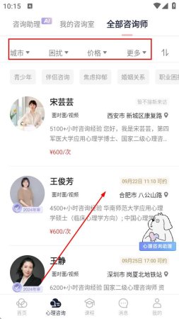 2、在全部咨询师页面,可以通过城市、困扰类型、价格等筛选条件,点击选中的咨询师。