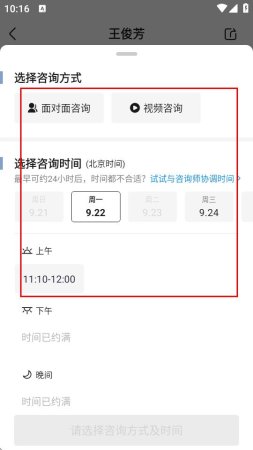 4、选择咨询方式,选择合适的咨询时间,完成预约流程。