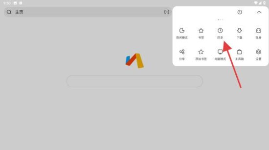2、在弹出的菜单中,找到并点击历史选项即可跳转到此页面中。