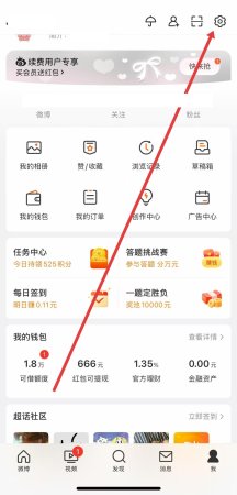 1、打开微博后,进入我的页面,点击右上角齿轮形状的设置图标,进行下一步操作。