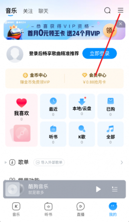 1、首先打开下载好的酷狗音乐APP,进入软件后点击右上角的【三】选项;