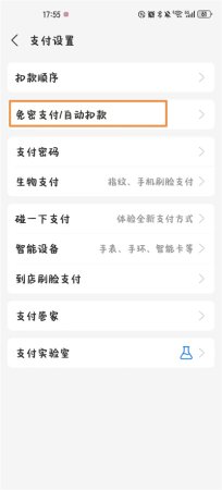 4、进入支付设置中可以看到免密支付/自动扣款这个选项,在这里就能关闭自动扣款啦;