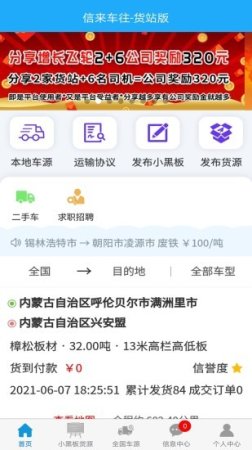 信来车往货站是一款物流配货平台,在这里就能精准查询到本地货源和车源,能够满足司机和货主的需求,货主线上就能发布运输需求,支持文字发布和语音发布,自行选择一种发布方式即可,根据信息提示即可完善资料,装货地址、卸货地址、货物名称、运费付款方式等信息填写后就能迅速发布货源,方便车主查找;而车主根据运输常跑路线、目的地地址和车型种类就能精准查找到货源,也可以发布车源信息,这样就能方便双方进行互动,根据提供的联系电话还能直接联系车主或货主,即时沟通。