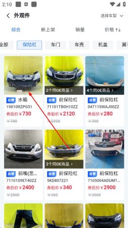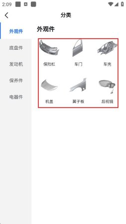 3、以点击“外观件”为例,进入分类页面后,选择保险杠、车门等具体配件类别。