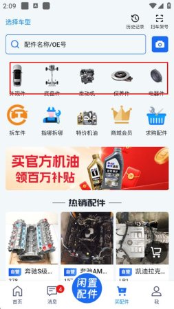 2、在“选择车型”页面,可通过搜索框输入配件名称或OE号查找配件,也能点击下方外观件、底盘件等配件分类图标。