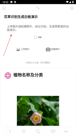 4、在花草识别生成白板演示界面,通过上传图片或拍摄照片上传花草图片,经识别后,可生成带配音的白板演示内容。