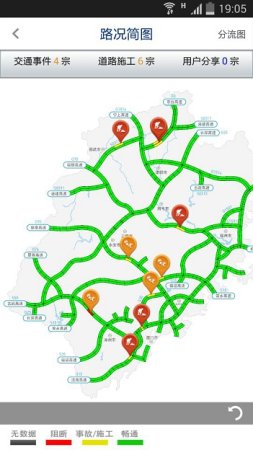 “路况简图”版块:以全省高速路网简图为基础,以颜色表示拥堵情况,直观地展示全省高速路网的通堵状态。